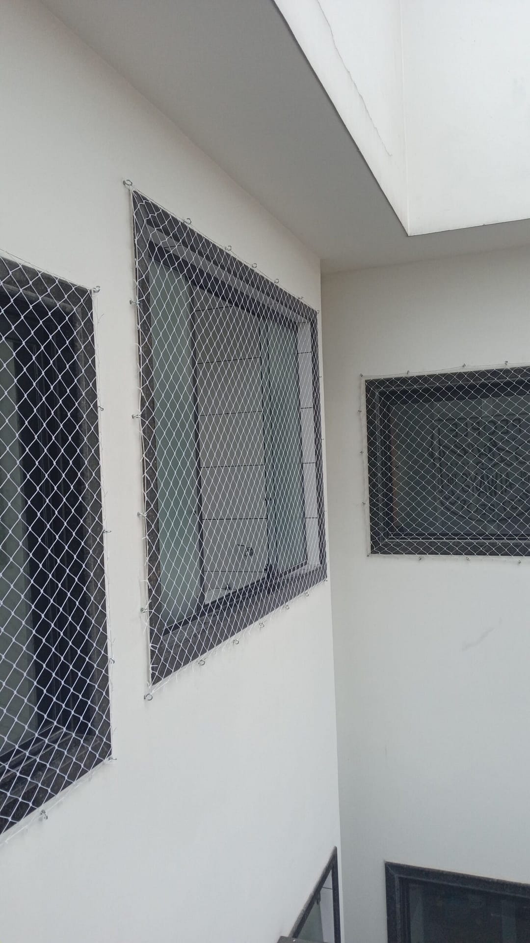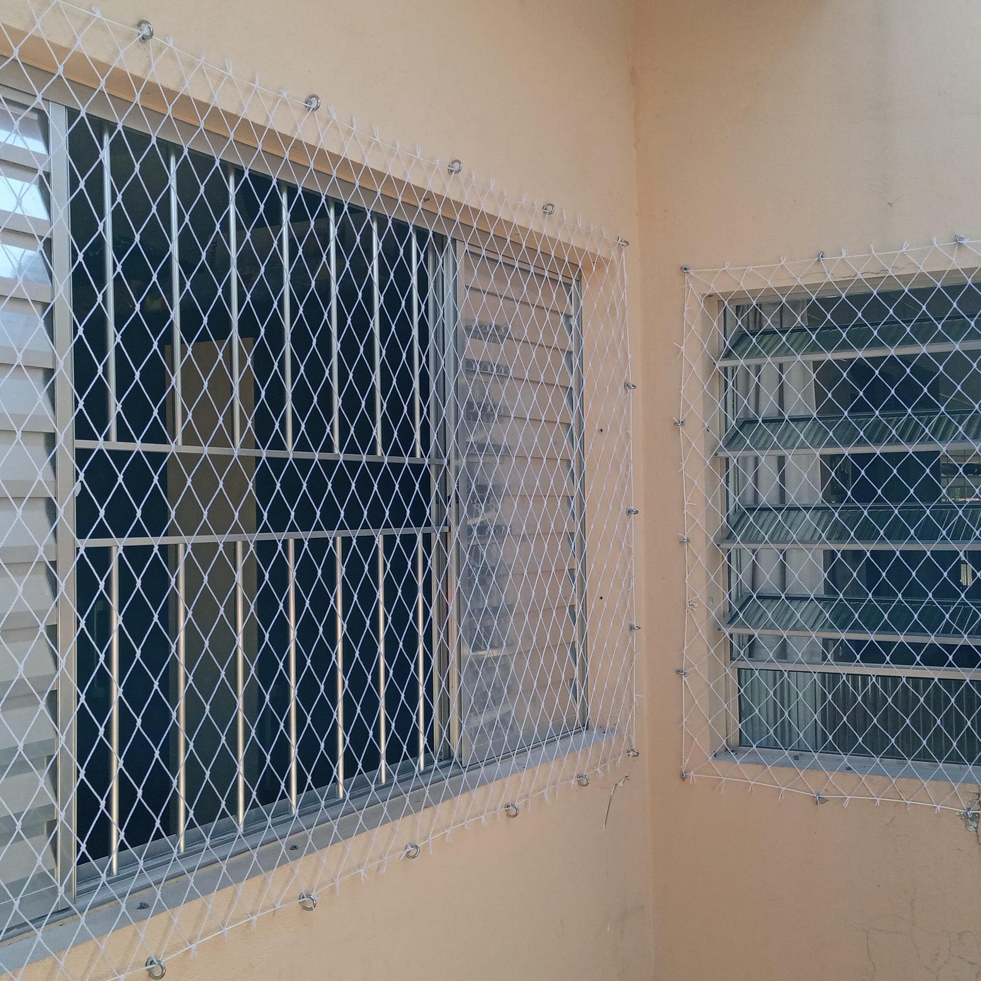 São utilizadas Redes de Proteção malha 5×5cm, fio 2,5 mm, e os ganchos e buchas nº8, padrão de materiais para instalações residenciais.